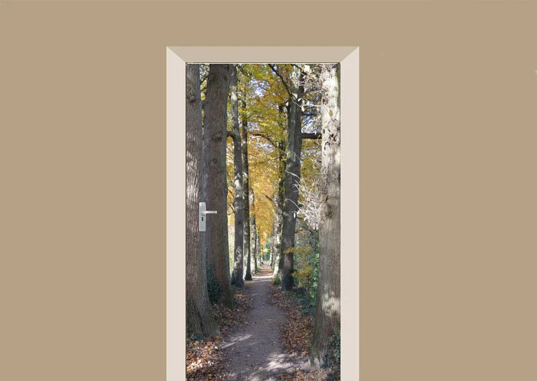 Op deze deursticker vind je de afbeelding van een prachtig laantje in het bos. De mooie herfstkleuren en de zonnestralen die door de bomen schijnen komen erg mooi uit op deze sticker.
