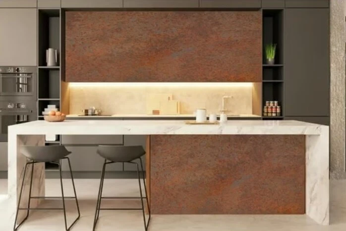 Cortenstaal is al enkele jaren een enorme trend. Wij spelen daar graag op in met ons plakfolie cortenstaal. Een mooie folie in cortenstaal look. Met als grote voordeel dat het roestkleurige materiaal niet afgeeft! Erg mooi op kastdeurtjes, keukendeurtjes en andere elementen in huis.