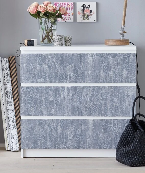 Velvet folie met veren print in grijs, wit. Zeer decoratief zelfklevende folie voor kastjes, meubeltjes, gladde wanden en objecten. Zacht velours folie dat je met behulp van een schaar of mesje eenvoudig op maat kunt knippen of snijden.