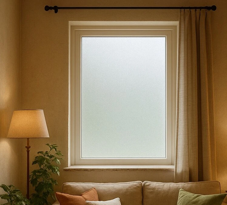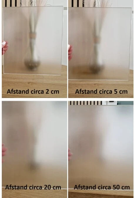 Decoratief raamfolie met een effen lichtgrijze look. De anti inkijk folie werkt erg goed. Je ziet er bijvoorbeeld nog wel een bloemenvaas doorheen, maar alles dat 100cm of verder van het raam staat, zie je niet meer. Dit folie zie je ook veel bij kantoren om meer privacy te creëren.