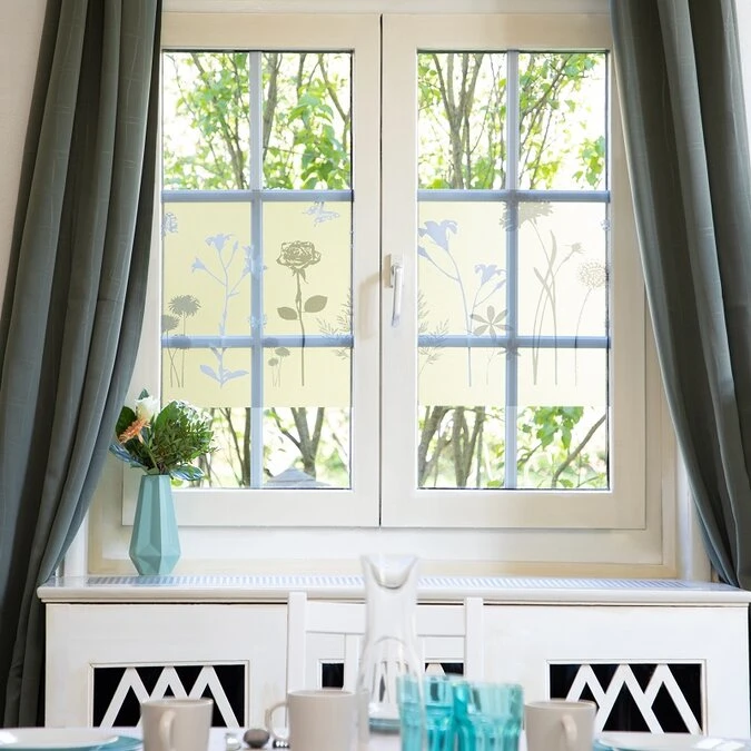 Statische raamfolie met leuke print van bloemen en vlinders. Werkt goed tegen inkijk en is, doordat het statisch is, makkelijk aan te brengen en tevens makkelijk te verwijderen zonder lijmresten achter te laten.