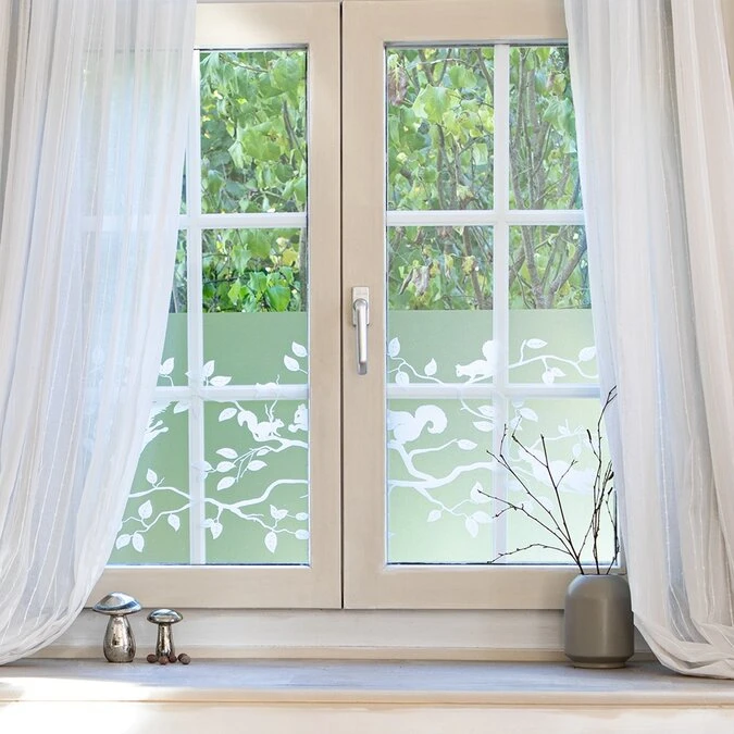 Statisch raamfolie met leuke print van eekhoorntjes op takken. Dit folie is inkijkwerend, al kun je direct achter het folie bijvoorbeeld wel een bloemenvaas zien staan. Fijn is dat het folie licht doorlaat. Statisch folie heeft geen plaklaag aan de achterzijde. Het hecht aan ramen doordat het statisch is.