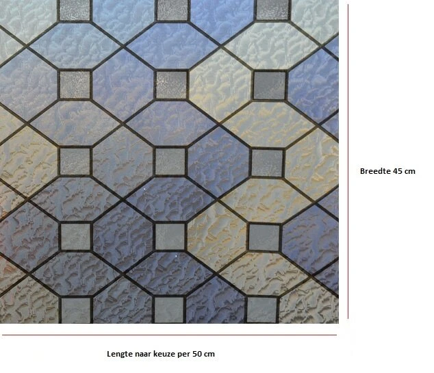 Raamfolie statisch met glas in lood patroon. Vermindert inkijk aanzienlijk. De breedte is 45cm, de lengte kies je zelf.