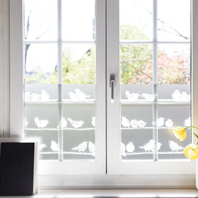 Statische raamfolie met vogeltjes, leuk en ook nog eens inkijkwerend! De breedte is 45cm, de lengte kies je zelf.